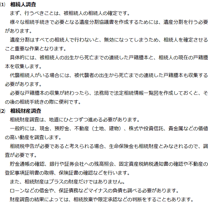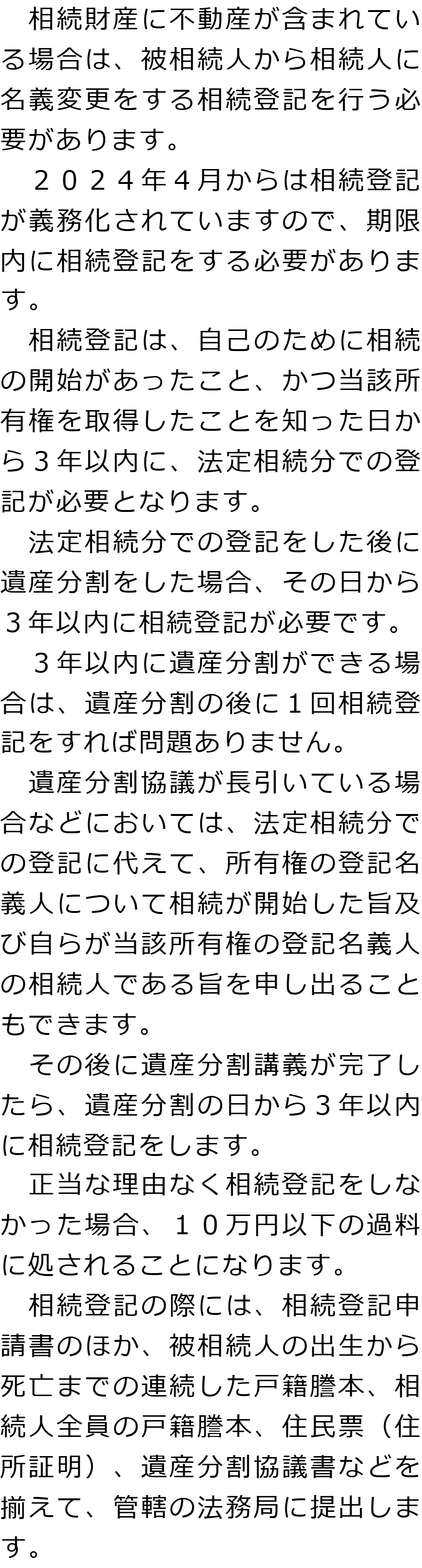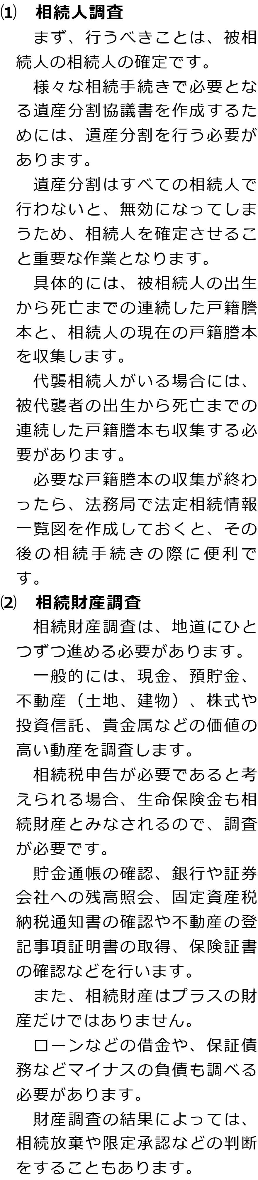 相続手続きの必要事項に関するQ&AQ相続手続きでは何をする必要がありますか?Q相続人調査と相続財産調査では何をする必要がありますか?Q遺産分割では何が必要ですか?Q相続登記はどのような場合に必要ですか?Q相続税申告はどのような場合に必要ですか? Q相続手続きでは何をする必要がありますか?AQ相続人調査と相続財産調査では何をする必要がありますか?AQ遺産分割では何が必要ですか?AQ相続登記はどのような場合に必要ですか?AQ相続税申告はどのような場合に必要ですか?A Q&A(目次)Q&Aトップ相続手続きの必要事項に関するQ&A 受付時間 平日 9時~21時、土日祝 9時~18時 夜間・土日祝の相談も対応します (要予約) 所在地 〒190-0023 東京都立川市柴崎町2-1-4五光トミオー第2ビル6F 0120-2403-39 お問合せ・アクセス・地図