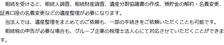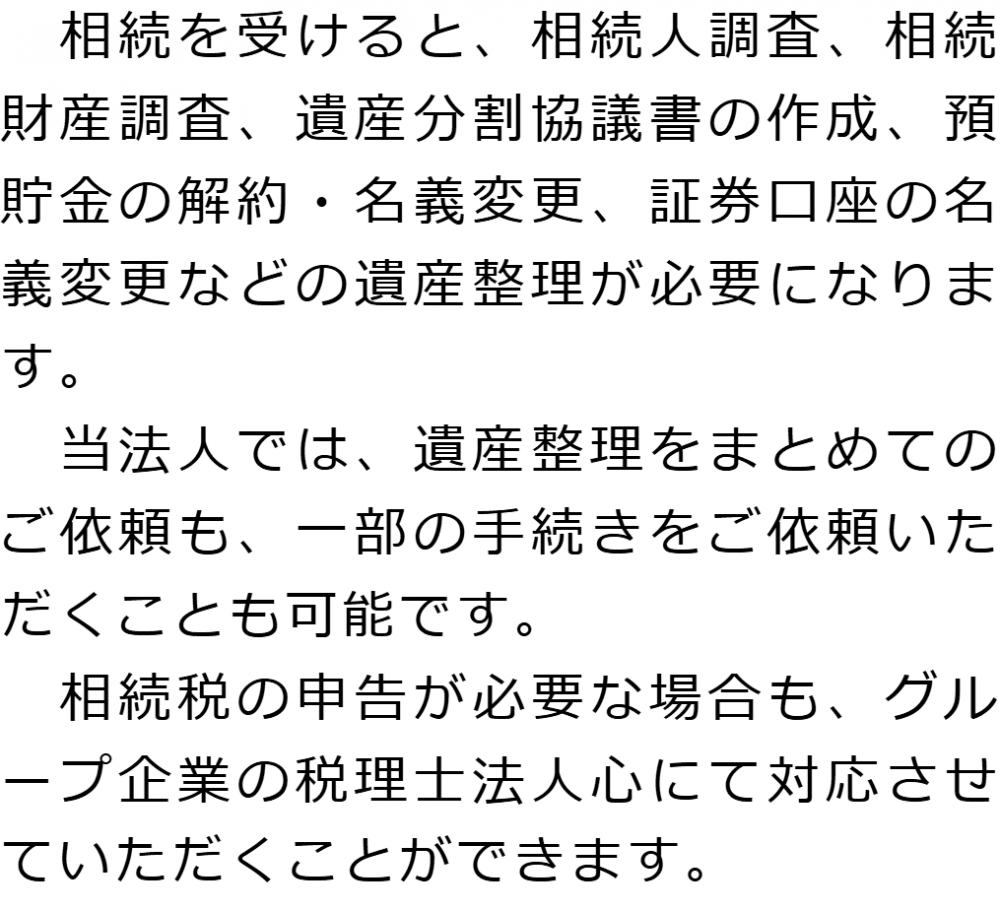 トップ業務内容遺産整理 階層構造▼ 業務内容(目次) 遺産整理 業務内容(目次)業務内容トップ行政書士法人心の業務内容遺言遺産整理相続人調査相続財産調査遺産分割協議書の作成預金・貯金の解約・名義変更証券口座の解約・名義変更自動車の名義変更心グループのその他の業務内容家族信託・民事信託節税対策事業承継遺言の検認相続放棄限定承認遺産分割遺留分侵害額請求相続登記相続税申告相続税調査 受付時間 平日 9時~21時、土日祝 9時~18時 夜間・土日祝の相談も対応します (要予約) 所在地 〒190-0023 東京都立川市柴崎町2-1-4五光トミオー第2ビル6F 0120-2403-39 お問合せ・アクセス・地図