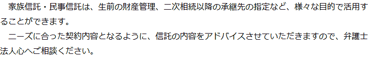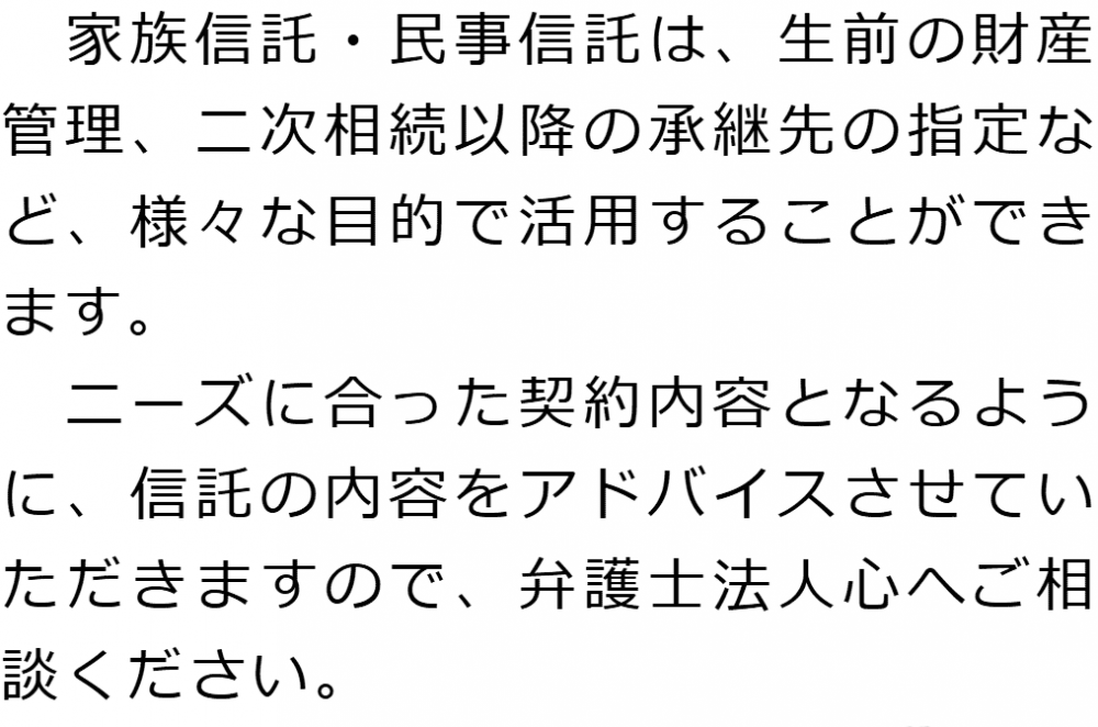 トップ業務内容家族信託・民事信託 階層構造▼ 業務内容(目次) 家族信託・民事信託 業務内容(目次)業務内容トップ行政書士法人心の業務内容遺言遺産整理相続人調査相続財産調査遺産分割協議書の作成預金・貯金の解約・名義変更証券口座の解約・名義変更自動車の名義変更心グループのその他の業務内容家族信託・民事信託節税対策事業承継遺言の検認相続放棄限定承認遺産分割遺留分侵害額請求相続登記相続税申告相続税調査 受付時間 平日 9時~21時、土日祝 9時~18時 夜間・土日祝の相談も対応します (要予約) 所在地 〒190-0023 東京都立川市柴崎町2-1-4五光トミオー第2ビル6F 0120-2403-39 お問合せ・アクセス・地図