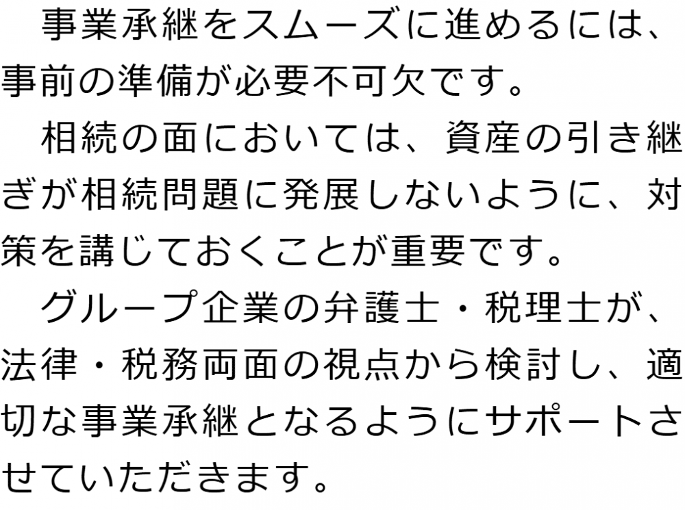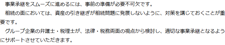 トップ業務内容事業承継 階層構造▼ 業務内容(目次) 事業承継 業務内容(目次)業務内容トップ行政書士法人心の業務内容遺言遺産整理相続人調査相続財産調査遺産分割協議書の作成預金・貯金の解約・名義変更証券口座の解約・名義変更自動車の名義変更心グループのその他の業務内容家族信託・民事信託節税対策事業承継遺言の検認相続放棄限定承認遺産分割遺留分侵害額請求相続登記相続税申告相続税調査 受付時間 平日 9時~21時、土日祝 9時~18時 夜間・土日祝の相談も対応します (要予約) 所在地 〒190-0023 東京都立川市柴崎町2-1-4五光トミオー第2ビル6F 0120-2403-39 お問合せ・アクセス・地図