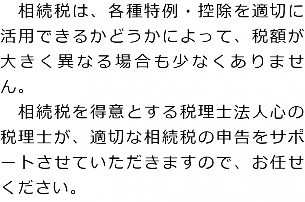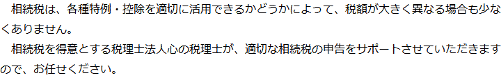 トップ業務内容相続税申告 階層構造▼ 業務内容(目次) 相続税申告 業務内容(目次)業務内容トップ行政書士法人心の業務内容遺言遺産整理相続人調査相続財産調査遺産分割協議書の作成預金・貯金の解約・名義変更証券口座の解約・名義変更自動車の名義変更心グループのその他の業務内容家族信託・民事信託節税対策事業承継遺言の検認相続放棄限定承認遺産分割遺留分侵害額請求相続登記相続税申告相続税調査 受付時間 平日 9時~21時、土日祝 9時~18時 夜間・土日祝の相談も対応します (要予約) 所在地 〒190-0023 東京都立川市柴崎町2-1-4五光トミオー第2ビル6F 0120-2403-39 お問合せ・アクセス・地図